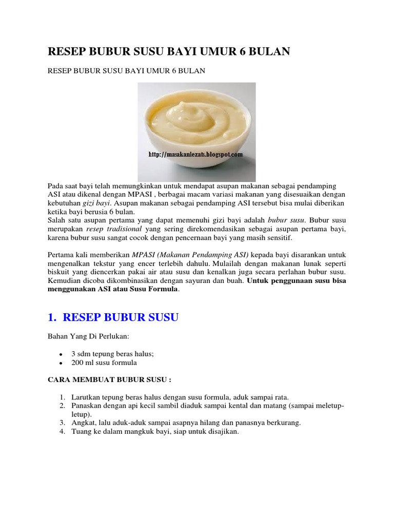 Baca resep dan daftar menu MPASI rumahan yg tidak bikin gemuk buat si kecil di siniBuat sendiri bubur bayi 6 bulan ke atas yang sehat buat bayi dan terbaik untuk pertumbuhan dan perkembangannya. Bahan bahan yang Anda perlu siapkan dalam membuat resep MP-ASI bubur susu biskuit diantaranya yaitu 20 gram biskuit dan juga 200 cc susu bubuk. Tumis bawang merah.